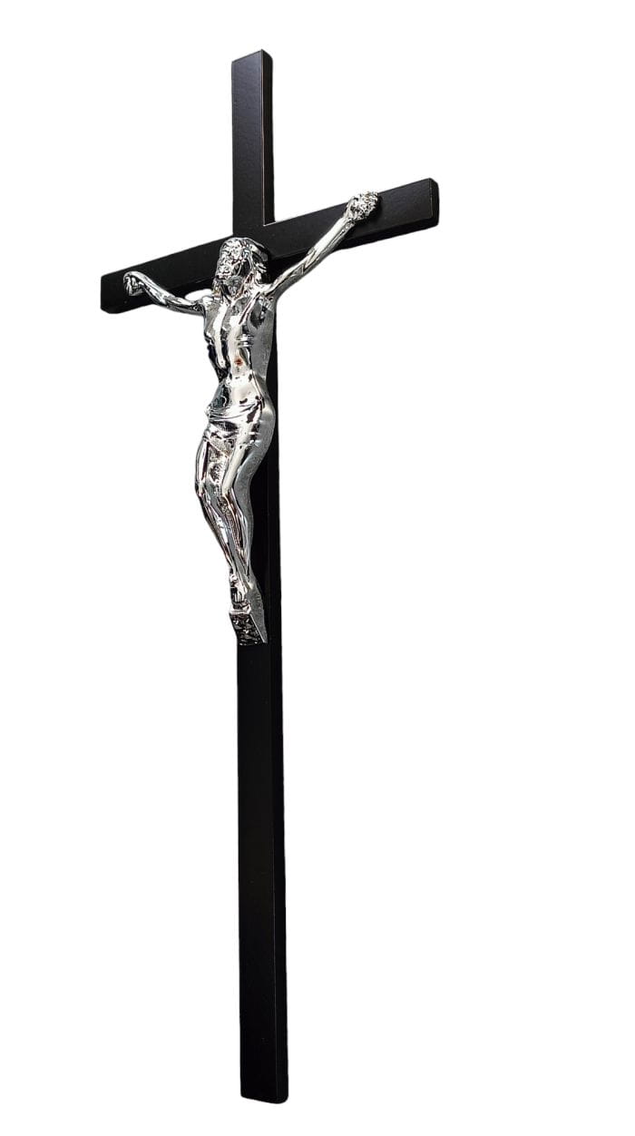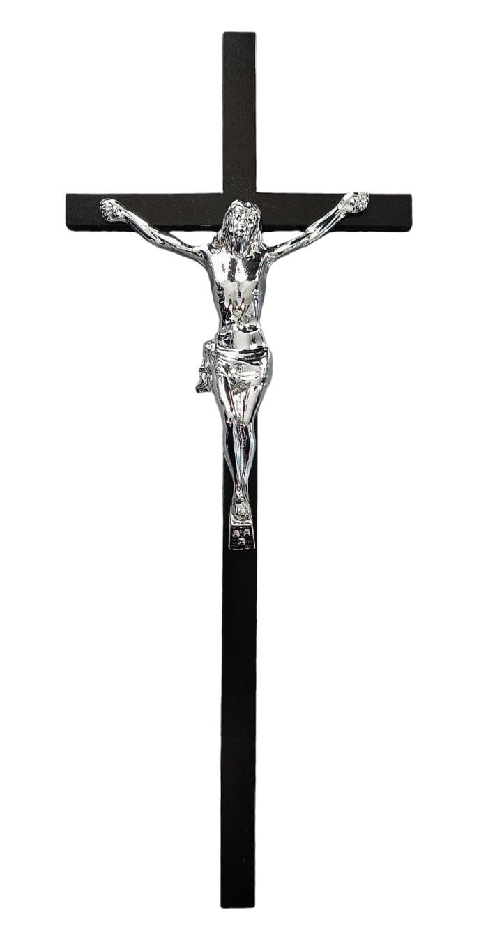 Krzyż w czarnym kolorze ze srebrną pasyjką.
